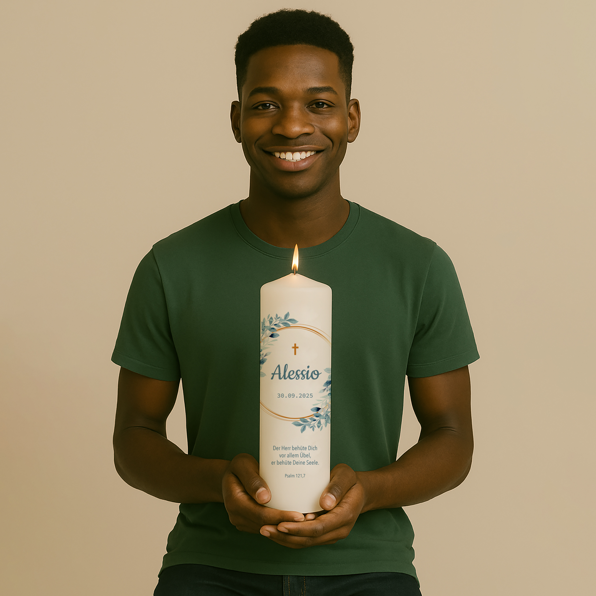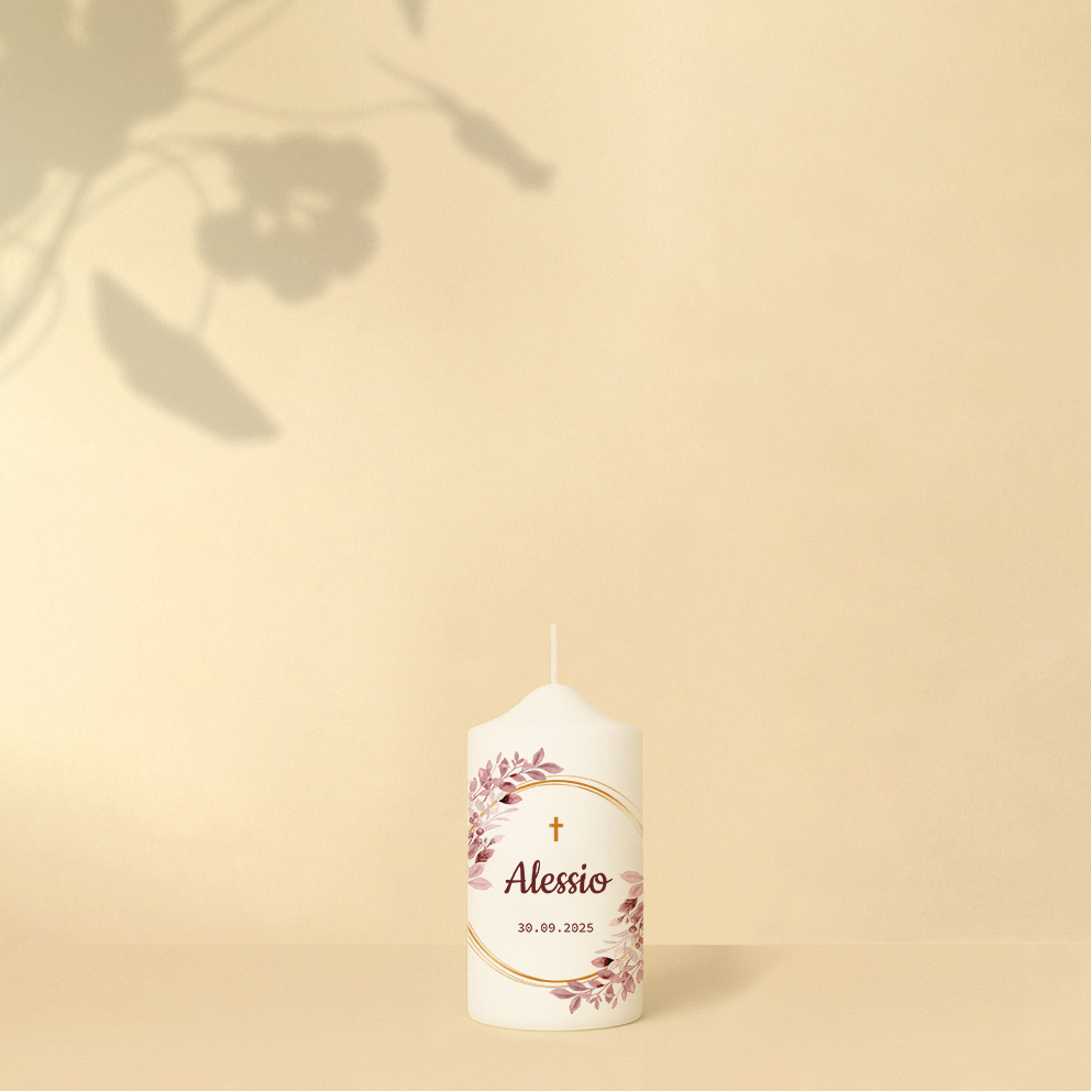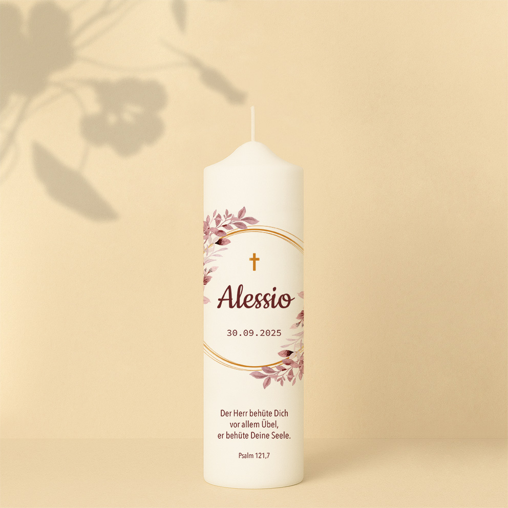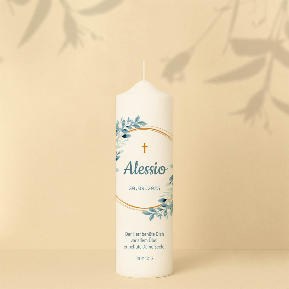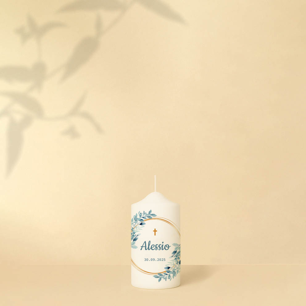 Schlicht und gleichzeitig doch elegant – das ist unsere Taufkerze Alessio. Die graublauen Blätter erinnern an die ersten Pflänzchen im Frühling, die ihre zarten Blätter der noch frischen Märzsonne entgegenstrecken. Der ockerfarbene Kranz verleiht der Kerze einen goldenen Glanz und versprüht ein Hauch von Exklusivität. Wenn gewünscht, kannst du noch einen Spruch ergänzen.