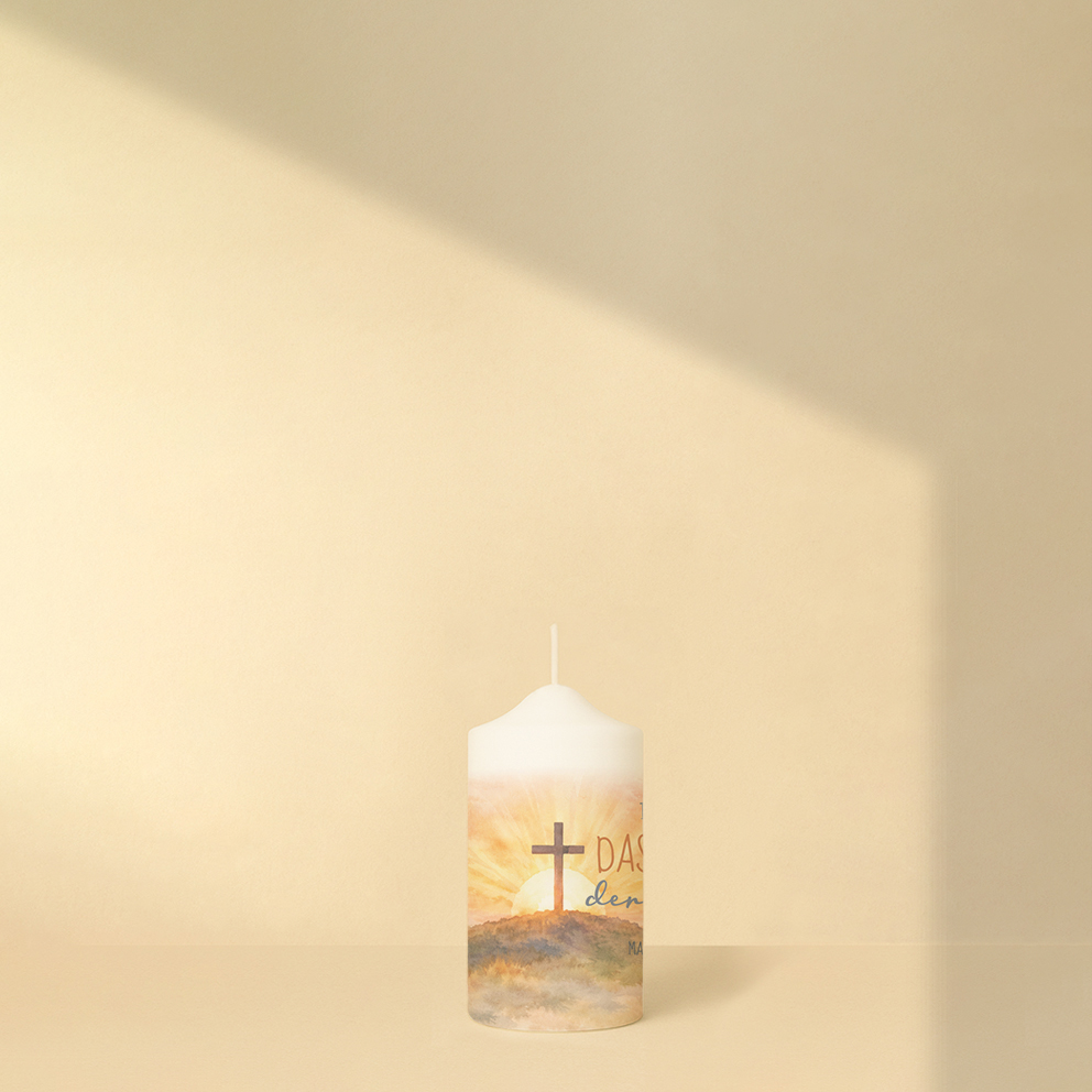 Stimmungsvolle Osterkerze mit Kreuz im Sonnenaufgang und Bibelvers – warm, hoffnungsvoll und modern gestaltet.