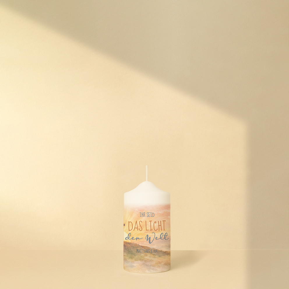 Die Osterkerze „Auferstehung“ verbindet eine hoffnungsvolle Osterbotschaft mit einer warmen, stimmungsvollen Gestaltung. Im Mittelpunkt steht das Kreuz auf einem Hügel, hinter dem die Sonne aufgeht und ihr goldenes Licht über die Landschaft strahlen lässt. Die sanften Aquarellfarben erinnern an einen neuen Morgen und symbolisieren Hoffnung, Auferstehung und neues Leben.
