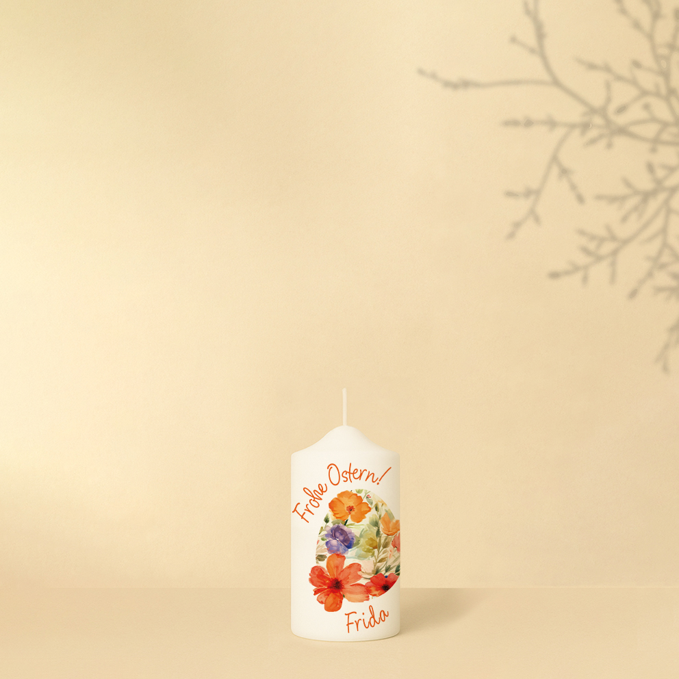 Personalisierte Osterkerze mit floralem Aquarell-Osterei – liebevolles Geschenk zum Frühling.