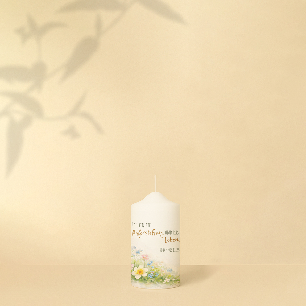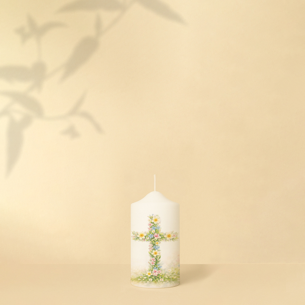 Die Osterkerze „Blumenkreuz“ verbindet die kraftvolle Botschaft von Ostern mit einer leichten, frühlingshaften Gestaltung. Das Kreuz ist aus zarten Blumen gestaltet und steht symbolisch für neues Leben, Hoffnung und Auferstehung. Die sanften Farben und floralen Elemente verleihen der Kerze eine natürliche, freundliche Ausstrahlung und erinnern an den Neubeginn des Frühlings.