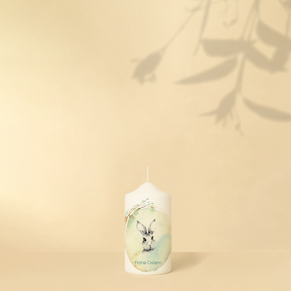 Zarte Osterkerze mit Hasenmotiv und Osterspruch – natürlich und zeitlos.