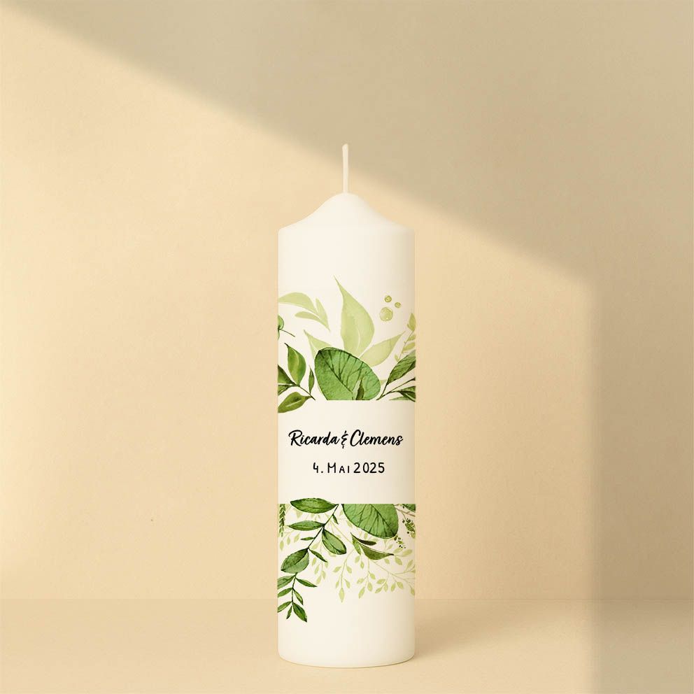 Ein Symbol für Liebe, Wachstum und den gemeinsamen Weg: Unsere Hochzeitskerze „Woods“ vereint natürliche Eleganz mit einer persönlichen Note. Die zarten Aquarellblätter in frischen Grüntönen umrahmen stilvoll die Namen des Brautpaars und das Hochzeitsdatum – ein harmonisches Design, das die Verbindung zur Natur und den Neubeginn feiert.